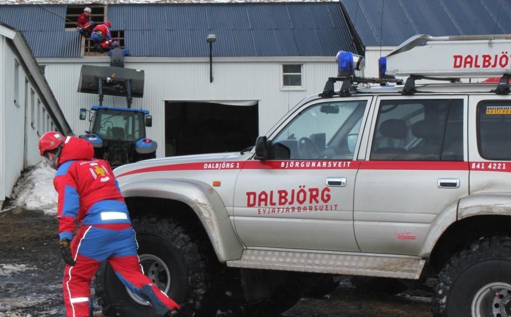 Hjálparsveitin Dalbjörg var kölluð út um hálf níu leitið í morgun vegna þaks sem var að fjúka á bænum